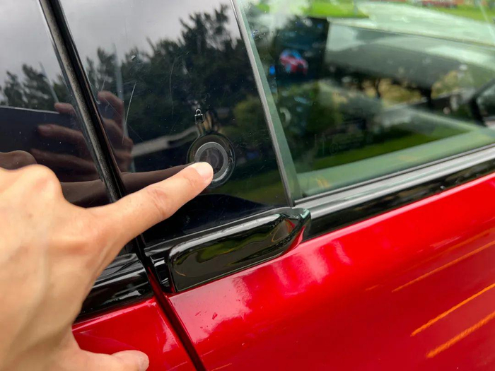 不同于外露式的门把手或者新能源车常见的隐藏式门把手,Mustang Mach-E是没有这个开门档把的,福特官方把这个设计叫做「E-Latch」,它的开门方式是按键式开关,B柱以及C柱,都有前后门对应的按键开关。