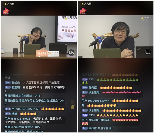 直播最后,骆玉明再次总结了作文解题的方法,“明确把握命题核心,清楚测定命题宽度,在宽度范围内找到最合适的文体、论点,明确一个主旨,从头贯穿到尾。”网友们纷纷为骆玉明精彩的案例拆解和妙语连珠的解说点赞留言,“跟骆老师学妙招,高考作文写得好”、“骆老师讲得很实用”。