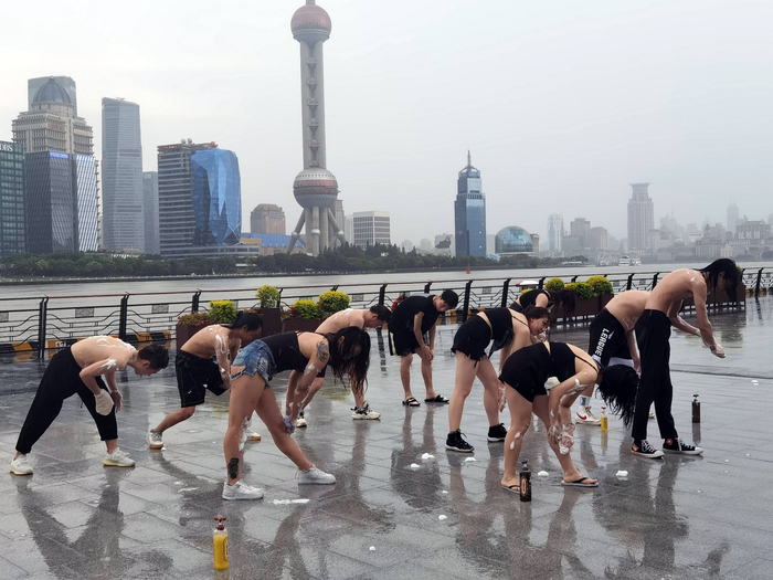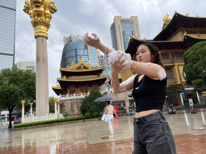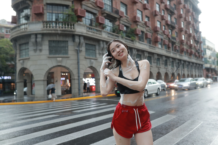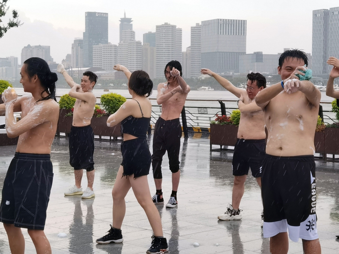 随着雨势的扩大,外滩、东方明珠、静安寺、武康路等地标处,陆续出现冲进暴雨中搓澡的市民。这些市民随手拿起浴巾、药皂等洗浴用品,在暴雨的冲刷下,尽情搓澡、享受,他们用雨水搓去身上的灰尘污垢,也在欢快的动作中,冲刷掉阴霾的心情。上海市民在雨中互相传递着欢快的氛围,伴随着哗啦啦的雨水,他们把快乐情绪扩散在上海的角角落落。