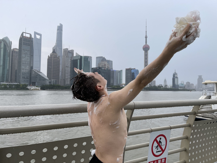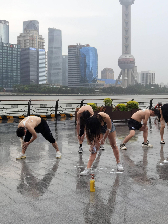 上海人被憋疯了,雨中洗澡的行为艺术火了!