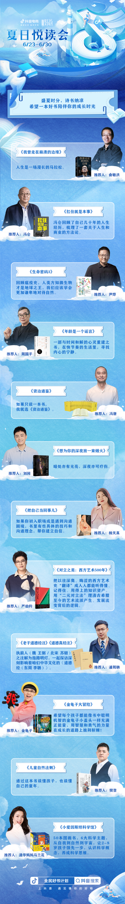 今年夏天,抖音电商推出“夏日悦读会”活动,邀请俞敏洪、周国平等12位优质电商创作者担任“全民好书计划荐书人”,以短视频和直播的方式向读者推荐优质好书,分享创作背后的故事。