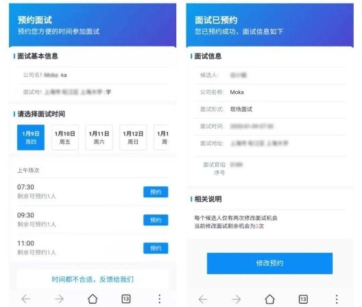 Moka「预约面试」支持候选人自主修改预约面试时间, 临时有突发状况也可以随机应变,调整更加灵活了。