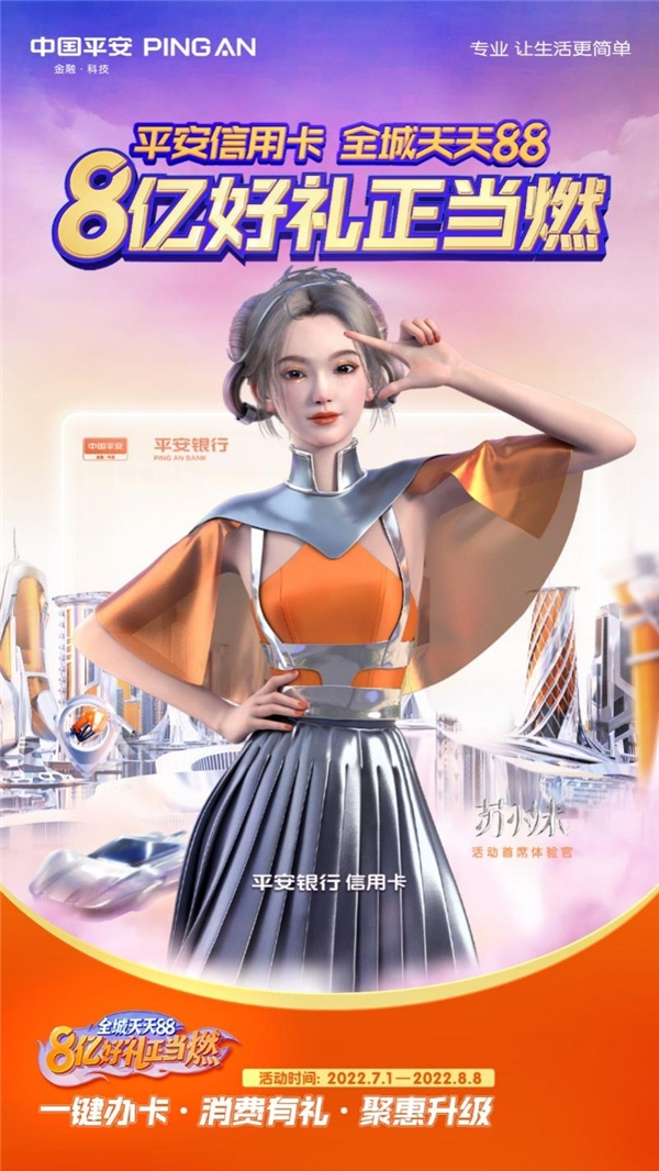 在国内疫情形势好转、市场逐步回暖,大众消费需求进一步释放的形势下,促消费、扩内需成为发展主旋律。7月1日,平安银行信用卡携手虚拟人IP苏小妹,以“8亿好礼正当燃”为主题在全国开启第四季“全城天天88”全域整合营销活动,并推出虚拟人主题双卡卡面。活动以充满科技感的元宇宙风格、“正当燃”的精神态度、价值8亿元好礼引领新潮消费体验,激活全民消费,助力美好生活。