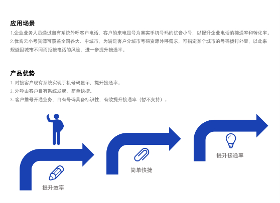 优音云小号主要用于客户有现成业务系统,且希望自己控制话务的客户,通过sip对接的方式,跟客户现有或者第三方公司的系统进行对接,实现呼入及呼出的控制(voip技术),客户的来显为优音小号,帮助企业提升接通率。