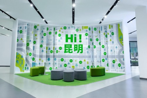 展示空间内陈设了雅迪换换系列车款,消费者可在众多车款中挑选出最适合自己的座驾;洽谈区背景墙上醒目的“Hi,昆明”标语一下拉进亲切感,营造出让客人感到放松与自在的休憩氛围。