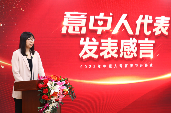 中意的每一次飞跃和荣耀时刻,都离不开所有内外勤伙伴的助力和支持,正是因为他们,中意的产品与服务才能得到越来越多客户的认可与信赖。开幕式中,中意人寿特别邀请江苏省分公司总经理凌小忠和北京分公司销售总监李一菲作为“意中人”代表,分享了他们的深切感触。凌小忠不仅分享了他作为中意员工对待服务的想法与感受,同时还从一位中意客户的角度,表达了对中意人寿服务的肯定和信心。李一菲也分享了自己与中意结缘、转换赛道并获得近千名客户肯定和信任的过程。她表示,因为选择中意而拥有了自己喜欢的工作方式和生活方式,因为选择中意而获得了更多的爱和成就。
