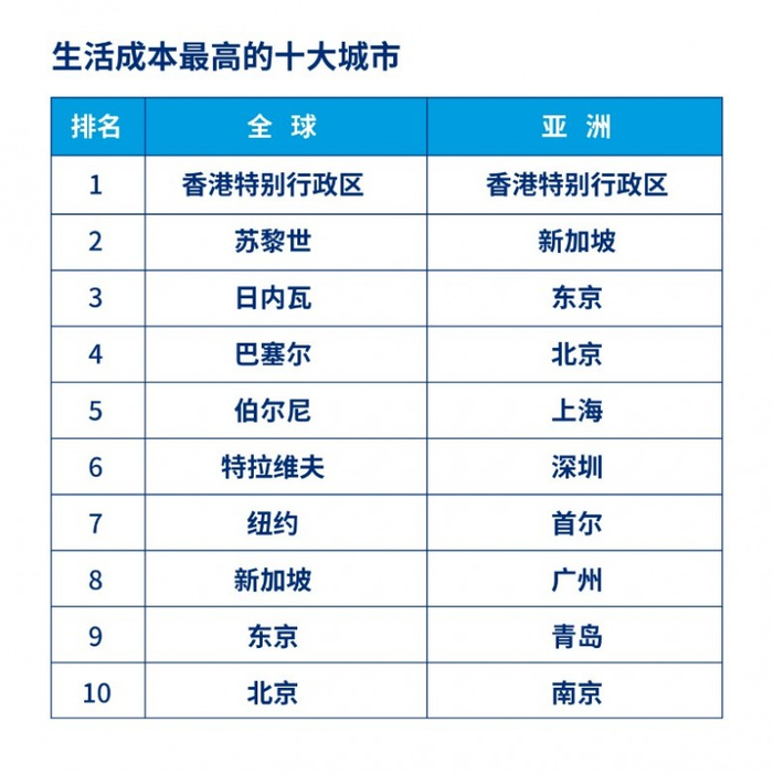· 全球生活成本TOP10城市中,有4个位于亚洲,其中香港特别行政区高居榜首