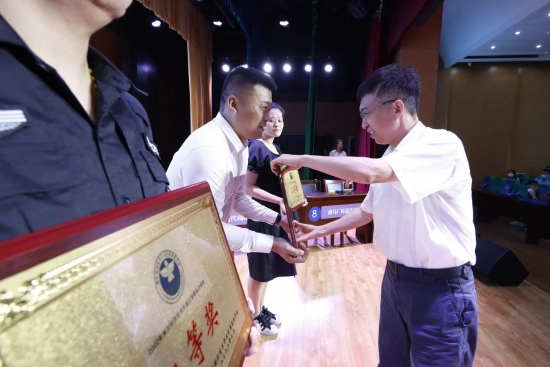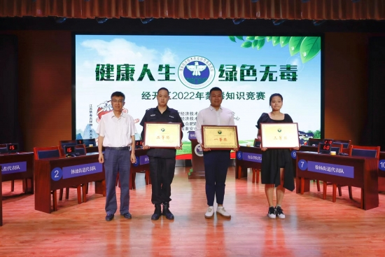经过紧张激烈的角逐,枚乘街道代表队获得一等奖,保安公司代表队获得二等奖,食品学院代表队获得三等奖,南马厂街道代表队、金港办代表队、合肥路小学代表队获得优秀组织奖,钵池街道代表队、新港办代表队、禁毒志愿者代表队、徐杨街道代表队获得道德风尚奖,区党工委委员、管委会副主任、政法委书记、禁毒委主任程国民,合肥路小学校长胡旭,市禁毒办副主任、市公安局禁毒支队副支队长苗康,分别为获奖代表队进行了颁奖。