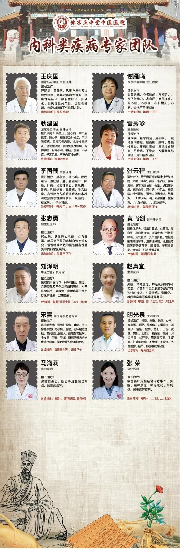 当然,大厅里最引人注目的当属一面颇具气势的专家墙。所谓“颇具气势”,是因为专家墙展示的师资队伍可谓实力强大,光芒熠熠。京城内外诸多名医赫然在列,国医名老、首都名师尽在其中。在中医内科专家方面,正中堂汇聚了国医大师、北京中医药大学终身教授王庆国主任,国家名老中医、中国中医科学院谢雁鸣教授,国家名老中医、首都名中医、首都医科大学耿建国教授,中国中医科学院雷秀珍主任,首都国医名师李祖珍主任,北京中医药大学肖延龄主任,中医世家第七代传人李国戬主任,清朝御医之后张云程主任,中国科学院仝小林院士弟子黄飞剑主任,北京鼓楼中医医院张志勇主任、宣武中医医院郭燕主任等10余位专家,可谓群贤毕集。