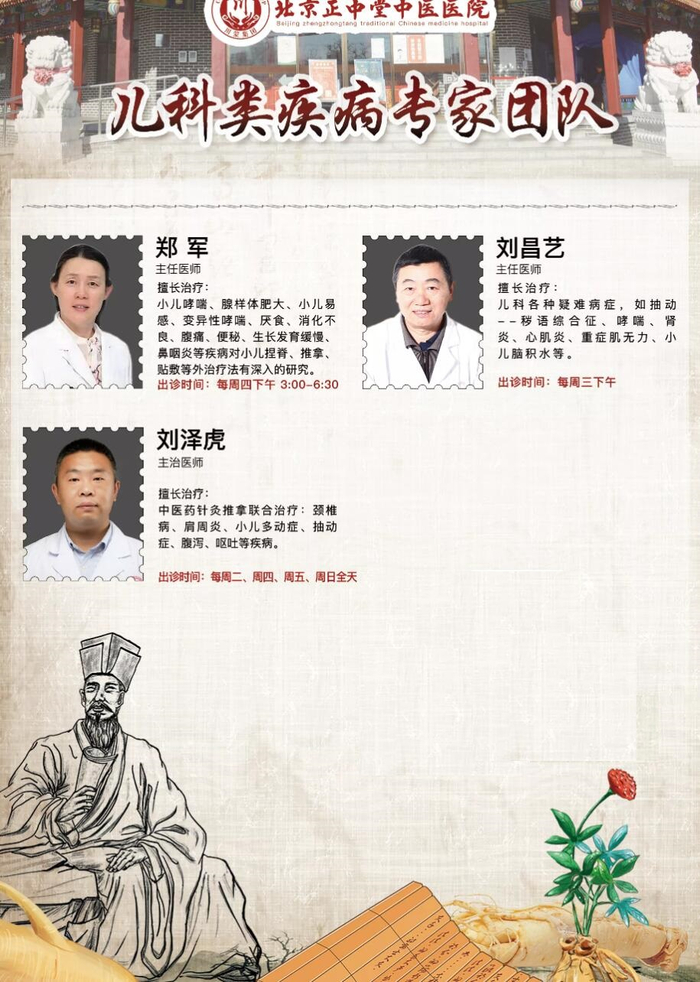 中医儿科专家方面,北京正中堂中医医院汇聚了北京市中医医院儿科郑军主任,望京医院肖和印主任以及京城小儿王“刘弼臣”之子刘昌艺主任等,以小儿抽动秽语综合征、小儿哮喘、小儿腺样体肥大、发育迟缓等疑难病为优势病种,结合小儿推拿、小儿捏脊等非药物疗法,形成了该院独特的中医服务。