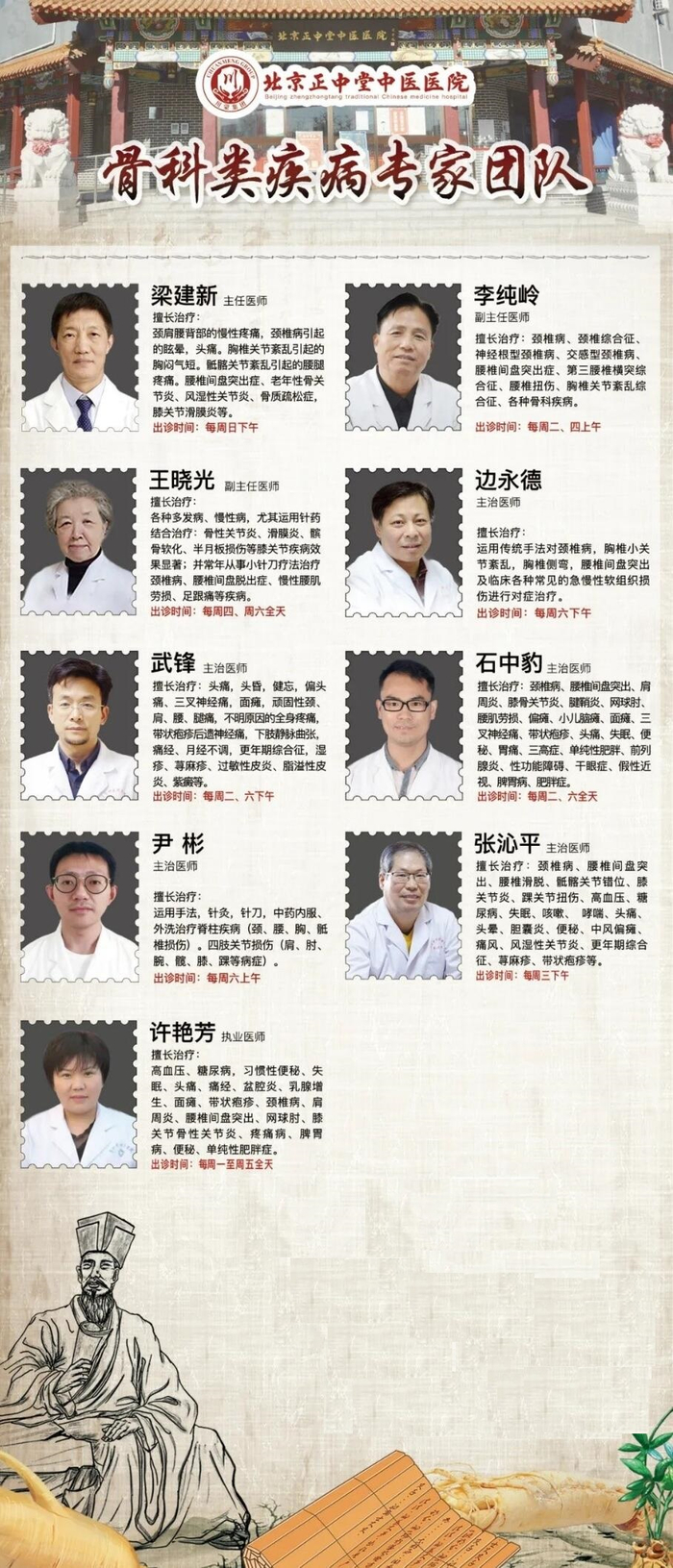 在中医骨伤专家方面,北京市中医院梁建新主任,从事临床工作近四十年的李纯岭主任,拥有二十余年临床经验的边永德主任,世界中医药学会联合会针刀专业委员会理事王晓光主任,原北京中医药大学东直门医院张沁平主任,双桥正骨医学研究院教研室尹彬主任,北京中医药大学副教授武锋主任等,均在这里出诊,以正骨、推拿、针灸、针刀等治疗手段,为患者治疗疑难颈椎病、腰椎间盘突出症、骨关节病等疾病。