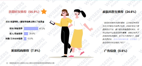 目前,入门级医美已经逐步融入我们的生活,“朋友圈口碑”响亮的医美项目正在受到越来越多的人重视,而相比美容机构推荐、皮肤科医生推荐、广告信息等,这届“医美消费者”更青睐亲朋好友推荐。当下,有六成消费者是朋友/闺蜜等熟人圈推荐是主要的了解渠道。
