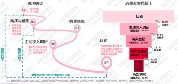 初入门的医美消费者并没有被琳琅满目的医美项目冲昏理智,而是对于医美项目先认知、到调研、到产生购买意愿才开始购买使用或复购。并且在消费后也乐于分享项目体验及项目评价,这使得“新入坑”、“新认知”的消费者有得参考,周而复始形成一个闭环。