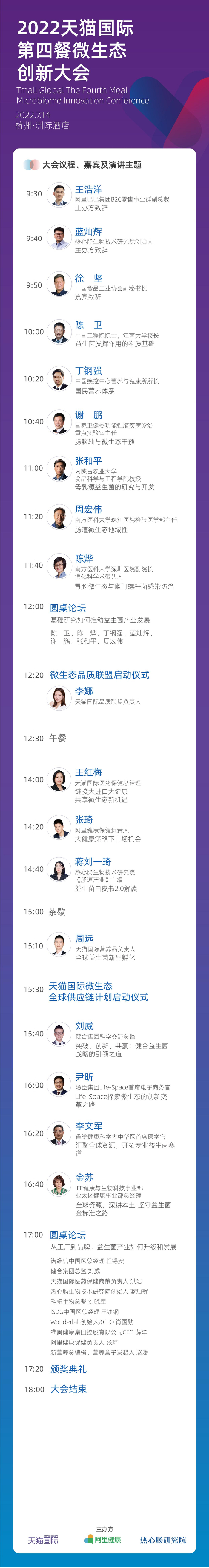 7月14日,杭州,天猫国际继续联手热心肠研究院邀您莅临“2022天猫国际第四餐微生态创新大会”,与专家学者、企业嘉宾、投资和监管机构代表,聚焦微生态学术研究、益生菌行业发展,发出行业正能量最强音!