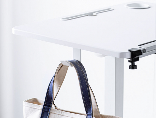 面板附带平板支架和水杯槽,底部设有防滑挡板,平时边上网课边写笔记,平板手机多屏办公都能从容应对,水杯或者笔筒也有地安置。侧边还有多功能挂钩,提包、耳机随手取放,避免了使用时需要到处翻找的情况。