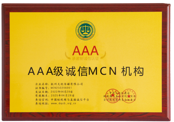 6月29日,在浙江杭州举办的第三届中国(杭州)短视频与直播产业峰会暨2022第十一届全球(杭州)新电商博览会上,聚焦行业信用建设,第一批短视频与直播诚信认证正式发布,无忧传媒及多位主播达人获AAA级诚信认证。