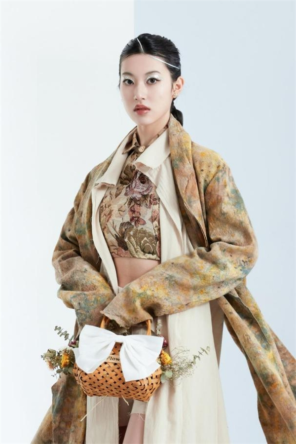 毕业设计作品中学生用草木、树枝、花朵、洋葱等对面料进行植物染色,用羊毛毡自制面料,在一次次的试验中寻找最佳的视觉效果,以多元的设计主张表达了疫情下对环境保护的反思和对生命意义的思考。