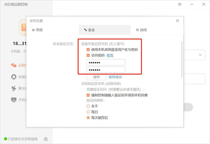 同一账号通过“设备列表”发起远控的情况,默认使用系统用户名密码验证身份,我们也可以在系统设置“安全验证方式”中,自定义一个“访问密码”,方便以后通过身份验证安全地进行远控。