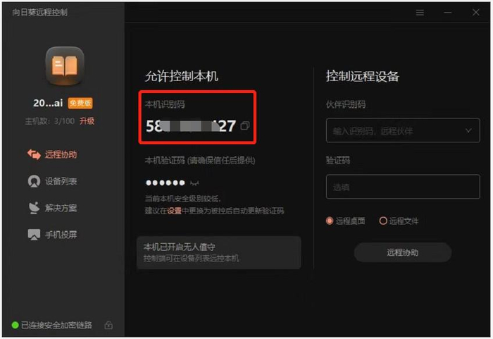 有远程协助需求时,需求方先将个人设备的向日葵【本机识别码】告知支持方。
