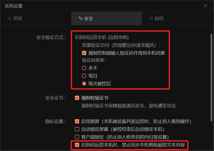 在系统设置,“安全验证方式”和“隐私设置”中,还可以开启【双重验证访问】、【验证码更新】、【客户端锁定】等功能,多重防护来加强被控方主机的信息安全。