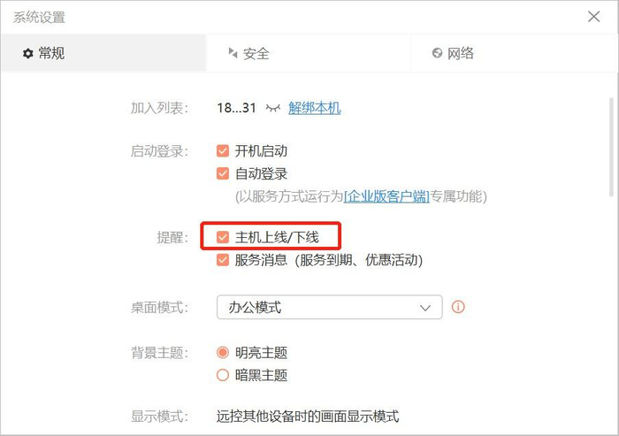 此外,在系统“常规”设置中,还可以设置 “主机上线/下线”提醒,手机下载向日葵远程控制APP后,就可以实时掌握远程主机的在线状态。