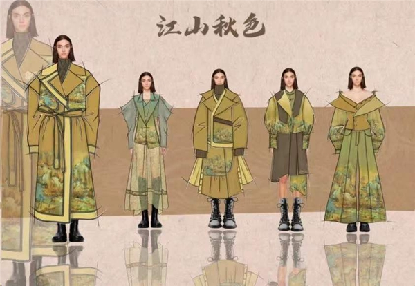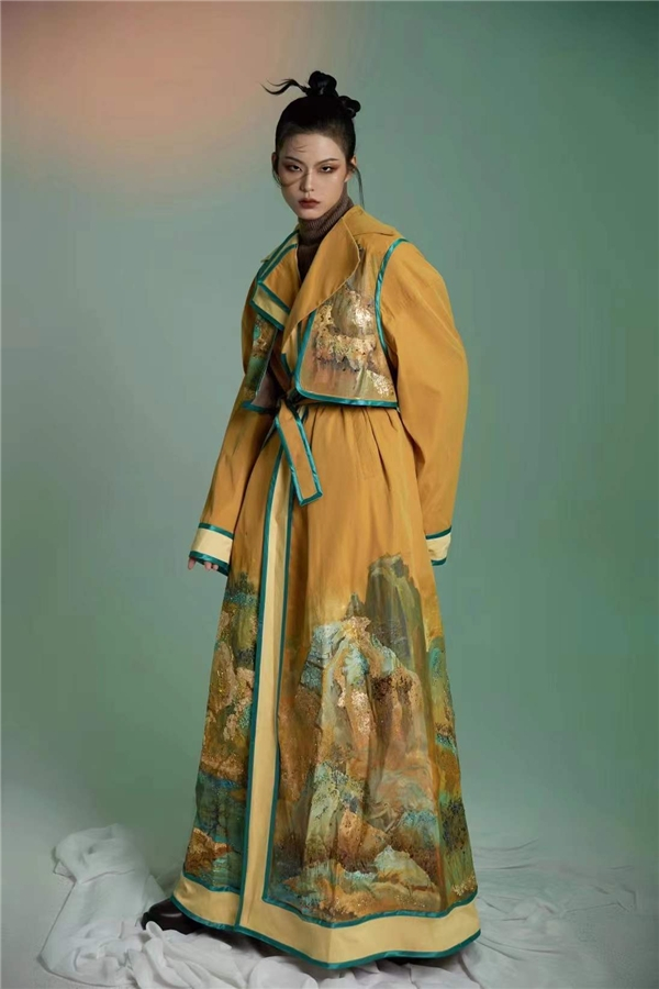 起初的想法是将山水与服装结合能够达到什么样的效果,如何配色表现。在众多山水画中,我被赵伯驹的《江山秋色图》吸引并开始对它深入研究。宋代开国皇帝赵匡胤的七世孙赵伯驹,以大青绿山水画名留画史。他的画风既有青绿山水的明丽,又有文人水墨画的雅逸。《江山秋色图》勾、皴精细工致,赋色相对以薄施为主,石青、石绿等石色分量较轻,仅在山岩之凸处、土坡之表面薄罩石青、石绿,花青、赭石等底色过渡自然。山石土坡普罩赭石色,水色先以较浓的墨青烘染而后薄罩石青,用白粉或朱砂点缀人物、房屋、小树的局部,《江山秋色图》作为承前启后的青绿山水艺术风貌,对研究后世青绿山水画技法有着重要的参考作用,同时作者对绘画技法纯粹的提取与组合能力,对当代青绿山水画法有着重要的指导作用。毕业创造成衣通过参考江山秋色图的色调和提取局部山水画运用到服装当中,结合异色面料和细节工艺的设计,吸引眼球的同时增添了层次感设计,颜色相撞带来别样的艺术魅力。