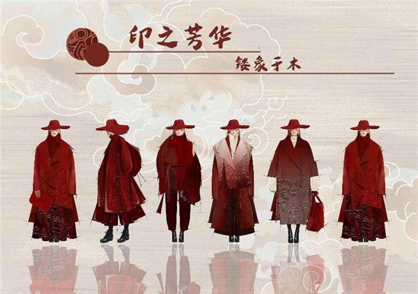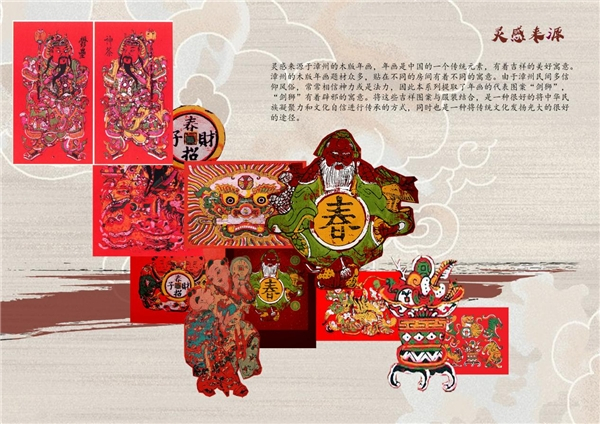 灵感来源于漳州的木版年画,年画是中国的一个传统元素,有着吉祥的美好寓意。漳州的木版年画题材众多,贴在不同的房间有着不同的寓意。由于漳州民间多信仰风俗,常常相信神力或是法力,因此本系列提取了年画的代表图案“剑狮”,“剑狮”有着辟邪的寓意。将这些吉祥图案与服装结合,是一种很好地将中华民族凝聚力和文化自信进行传承的方式,同时也是一种将传统文化发扬光大的很好途径。