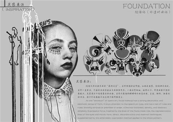 莆仙戏脸谱的“表情艺术”,具有很强的装饰性,一条线有粗细、疏密之分,有着抽象简洁的表现力。系列设计以莆仙戏“包拯”脸谱为典型案例,提取莆仙戏脸谱艺术元素,在此基础上尝试对莆仙戏“包拯”脸谱进行“点、线、面”的抽象化再设计,以“一条线-半边脸-整体面”的设计形象,尝试将古戏曲脸谱艺术元素与现代女装设计理念相结合。