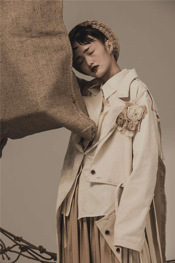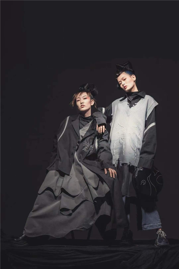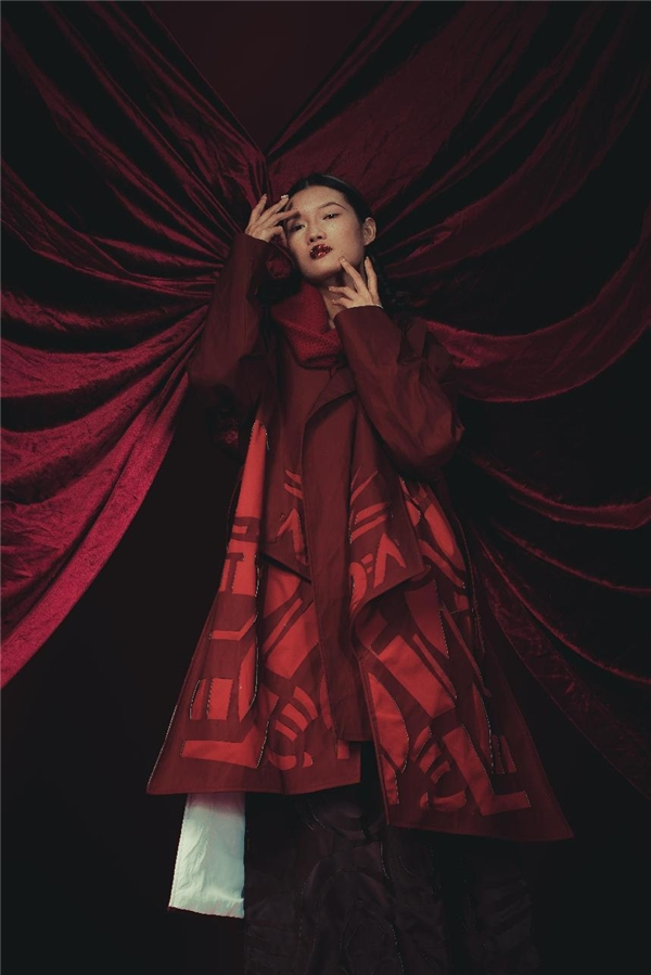 本系列设计以“熔岩焦石〞为灵感切入点,设计并制作出一套具有冲突对比、简约大气的服装。整套衣服采用黑白红橙为主色调,对比冲突的色调,黑与白表现焦土下的巷白景色,而山形图案则代表火燃烧着。利用籍绒技术,结合戳秀营造出肌理的高低层次感,以传统自然凝结而成的材质为媒介所创作的艺术呈现,与现代化工业文明产品存在差异性,利用作品表达了来自不可抗力的自然灾害因素的指向性,呼吁世人重视自然保护。