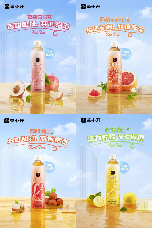 茶小开在深入研究、不断实践的基础上,推出4种口味的果汁茶饮料,分别是:蜜桃乌龙果汁茶饮料、西柚茉莉果汁茶饮料、荔枝滇红果汁茶饮料、柠檬滇红果汁茶饮料。