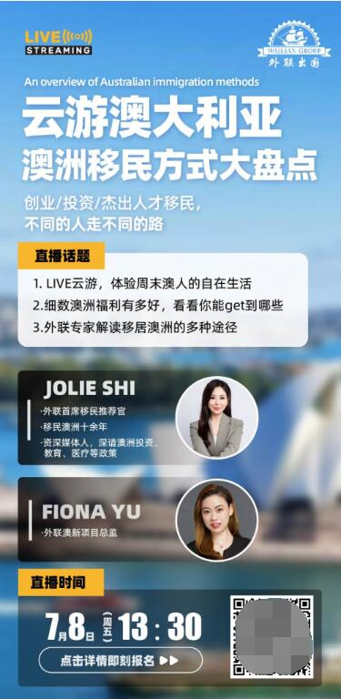 旅客仍然必须遵守现有的其他COVID-19要求,如在入境国际航班上戴口罩,而基于州的口罩规则也将继续存在。此外,DPD(数字旅客申报单)也不用研究怎么填了!内政部长克莱尔·奥尼尔(Clare O 'Neil)表示:“取消这些要求不仅会减少机场延误,还会鼓励更多游客和熟练工人选择澳大利亚作为目的地。”暂时还没动身的朋友,不如先来外联出国直播间,带你云游澳大利亚,我们将连线在澳洲的外联移民推荐官,详细盘点澳洲移民方式,扫码即可报名。