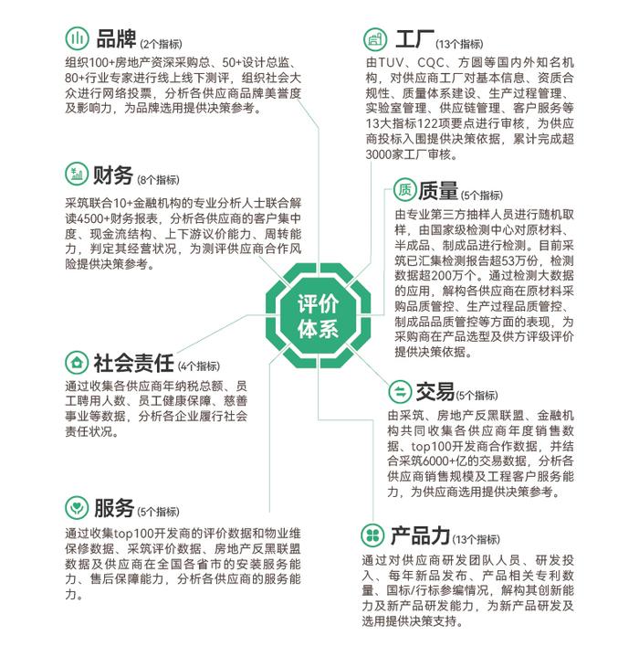 采筑将SCI评价内容与万科30多年供应链管理经验,以及行业权威机构的供应链管理成果充分结合,输出2021《采筑建材行业指南》,为行业提供一份客观公正,能快速摸清产品力风向,全方位了解供应商实力的供采合作指导工具书,辅助采购商客户准确、快速决策,佐证供应商综合实力。