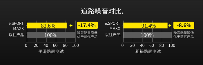 新品采用新一代变性聚合物搭配压力控制技术,减少行驶过程中不必要发热,减少行驶过程中能量损耗,带来理想的低滚阻性能和耐磨耗性能。同时为了达到人车合一的从容“静界”,采用降噪花纹设计,并搭载住友橡胶研发的SILENT CORE降噪内核技术。较以往产品相比,新品能够有效缓解新能源汽车的胎噪问题。通过道路噪音对比实验结果显示*1,在平滑路面表现上,e. SPORT MAXX的降噪效果高于以往产品17.4%;在更加严苛的粗糙路面表现上则高出8.6%,全面遏制噪音,展现了出色的降噪性能。