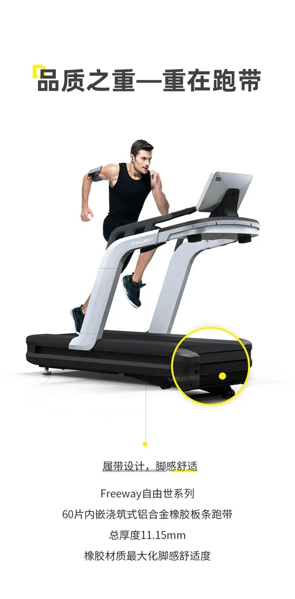 值得一提的是,Freeway自由世系列的全新履带式跑带,加上硫化橡胶材质,可以充分吸收来自脚面的不规则冲击,发挥出最接近自然情况下的步态,同时减震性能高于传统跑板30%,对关节损伤小,赤脚跑步也能行步如飞,最大化发挥自己的运动表现。
