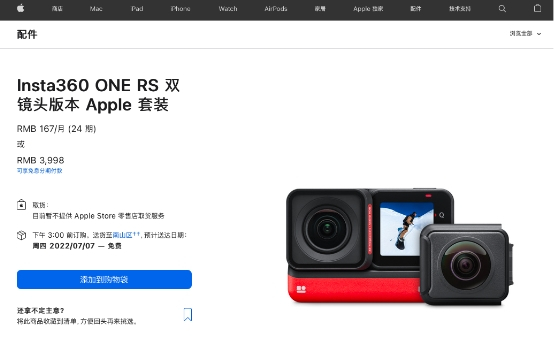 Insta360 ONE RS双镜头版本Apple套装,已正式在Apple Store在线商店发售。除GO 2和ONE X2外,ONE RS是Apple Store在售的唯一一款运动相机。自2016年消费级产品Nano获得Apple的MFi认证以来, 影石已有7款产品先后入驻Apple Store。