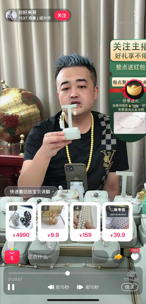 “我们直播间的优势就是扎根于中国珍珠的主产地浙江诸暨,货品种类多,货源充足,供应链反应速度快。比如今天我们直播间没有粉丝们想要的珠宝款式,我们明天就能在直播间立刻上架,只要粉丝一直蹲守直播间就行,就是这么快!”