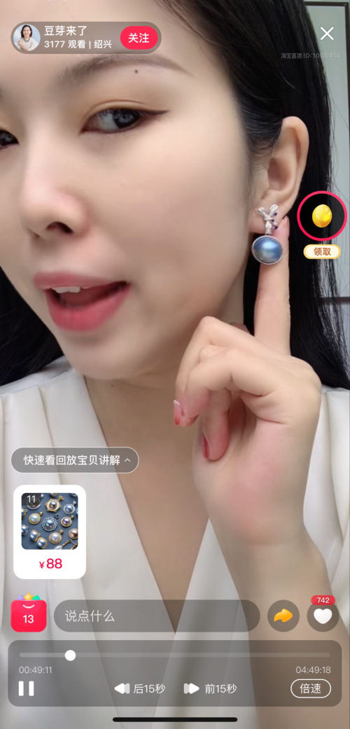 拥有20年珍珠饰品批发经验的珠宝主播“豆芽来了”,5月份从抖音转换平台,入驻淘宝直播后,在618期间就突破了百万GMV。