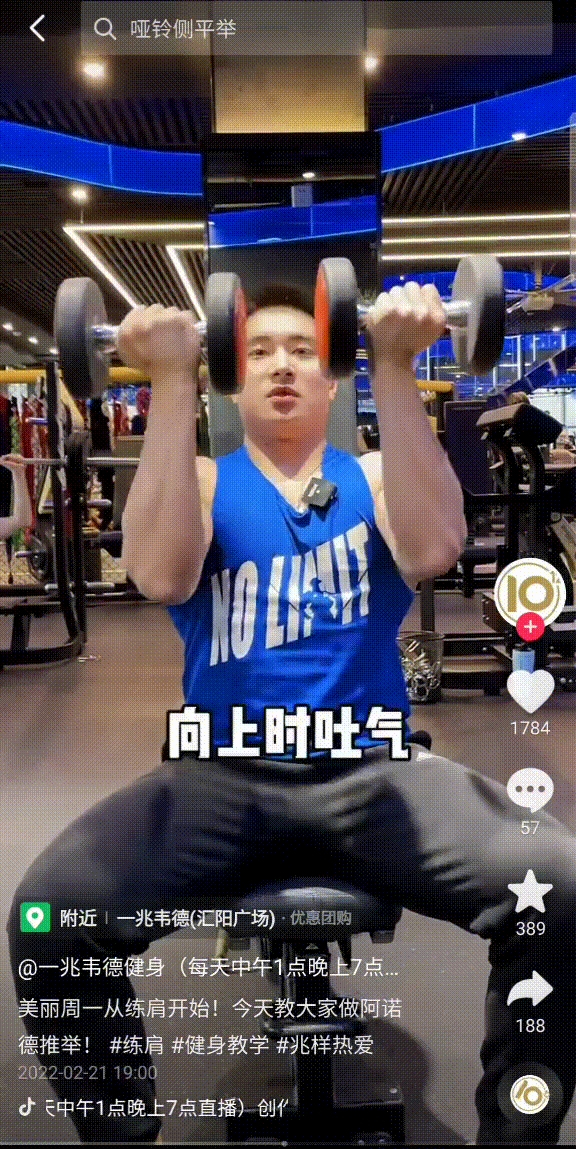 官方账号“一兆韦德健身”的视频主要在健身房内拍摄,由教练进行器械动作讲解和教学,比如“阿诺德推举”“坐姿划船训练器”“仰卧推臂上拉”“史密斯机硬拉”等。针对流行话题和受众人群,他们会紧跟热点策划内容。