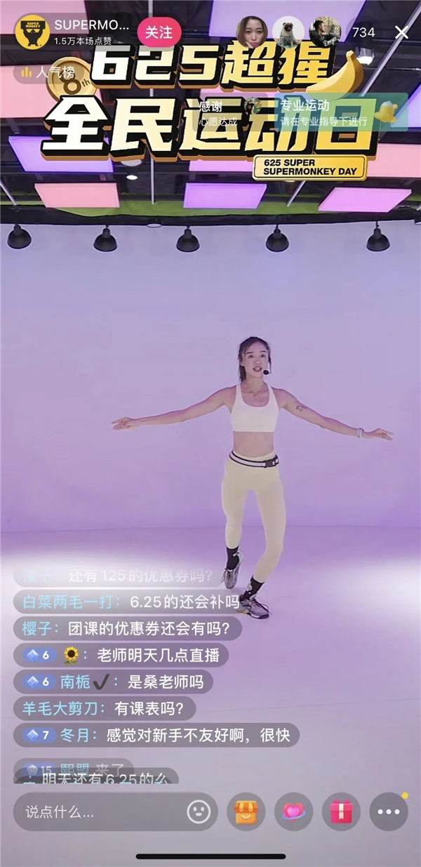 同样受到疫情影响的超级猩猩,在今年3月重新启动“超猩家里蹲”的直播,带观众一起健身,场观从几千人次逐步稳定到几万。
