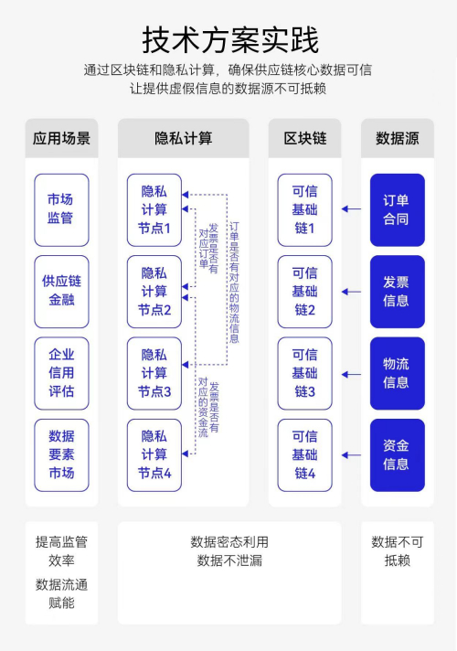 针对这个问题,八分量给出的解决方案是:引入区块链和隐私计算技术,同时将供应链上下游企业的数据上链,查验供应链上下游的核心数据是否可信,再让提供虚假信息的数据源不可抵赖。