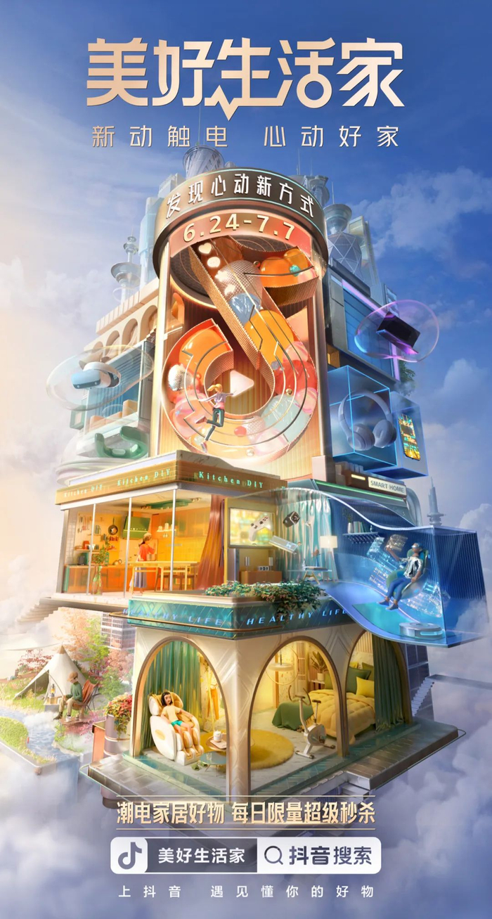 6月24日至7月7日,抖音电商消电家居行业同步发起「美好生活家」活动,以家电领域「新动触电」与家居领域「心动好家」双线并行的方式,用“心动好物”激发兴趣欲与消费欲,满足用户对“美好生活”的核心向往,并通过直播间、打榜赛与话题活动,为商家与品牌提供全域兴趣电商下新的生意增长机会。