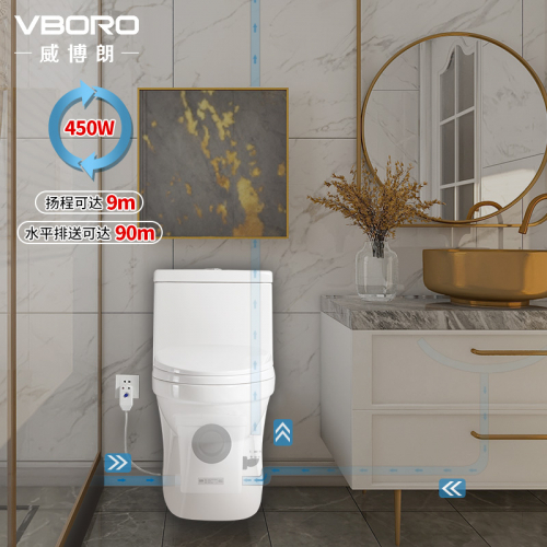 此外,威博朗一体式电动马桶的排污管道在22-33mm之间。扬程高达9m,污水的水平输送距离却长达90m,实现任意空间内快速排放。