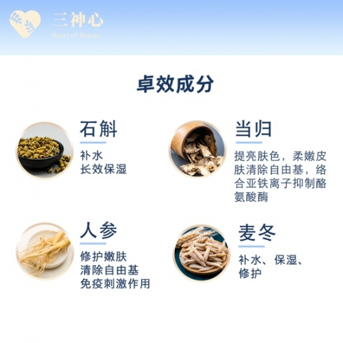 宗博士告诉我们:“近些年来,随着电视媒体、网络媒介的传播流行,面膜种类繁多,消费者没有火眼金睛,面对铺天盖地的广告更是无暇精挑细选,而目前不少品牌的面膜含有“致癌物质”“重金属超标”“防腐剂”“荧光剂”等有害化学物质,消费者使用后容易产生不同程度的皮肤损害。我实在不忍心看到前来就诊患者的痛苦面容,想要为患者改善症状。中医药文化在美容护肤领域的运用传承千年,众所周知的阿胶糕、七白散等美容护肤圣品,都并非新研发的产品,而是根据优质古方改良而成。但仍有很多凝聚着千年中医药智慧的古方未被发掘和应用,加之大部分中医药制品制造工艺和手段简陋,导致中医药护肤理念未被大众所熟知。因此我想要结合中医药的整体观、辨证论治,做一款合适证型的中医药护肤产品。在临床案例中我发现,中医药护肤配方加入透皮剂后能更快渗透进入肌肤,长期使用甚至能够调节整个机体,使肌肤状态达到整体平衡,从而真正改善肌肤状态。基于让每一位爱美的人都可以用的放心、舒心、开心的期望,于是我便创立了三神心这个品牌。”