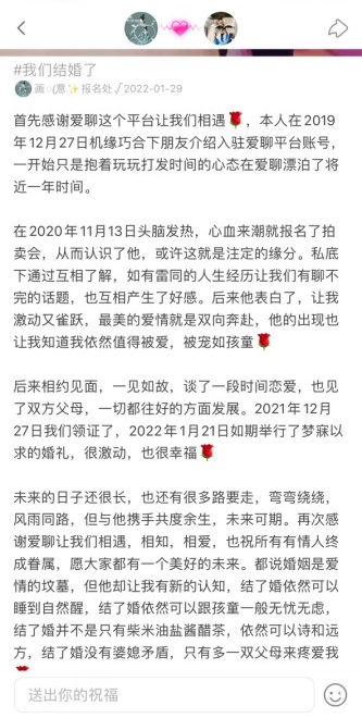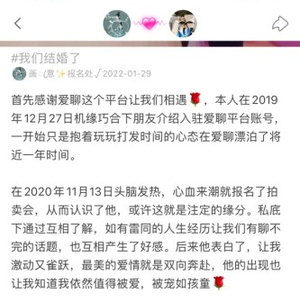 他们之所以能走到一起,除了有追求爱情的希望和勇气,也离不开爱聊APP给他们提供的真实、温暖的平台氛围。