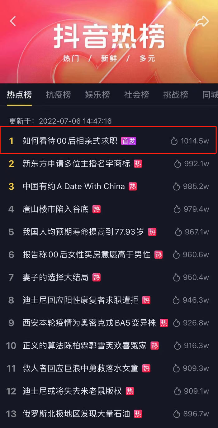 几位大咖在面对00后相亲式求职的交流探讨中更是金句频出,“不要给00后画饼,00后不吃这一套”、“00后可以低头工作,但不向工作低头”……等犀利的求职观解读引发了全网热议。#如何看待00后相亲式求职#这一话题登上了抖音热榜的TOP1。