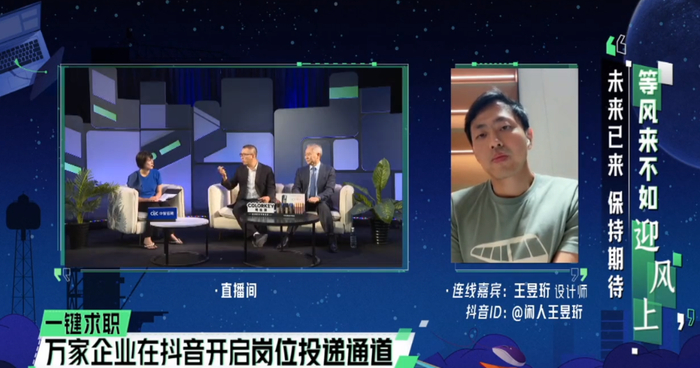 7月5日18点-21点30分,抖音《开场白》进行了一场特别的直播—《开场白-职到遇见你》。该节目邀请周轶君、徐洪才、储殷三位就业指导专家与大咖嘉宾坐镇直播间,并连麦樊登、郎永淳、毛大庆、王昱珩等多位社会各界名人一起探讨就业问题。