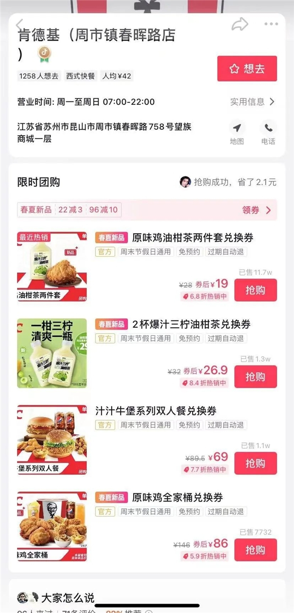 有用户表示,他从自己长期关注的抖音美食博主@福州干饭网的视频中得知,肯德基推出了新品组合“三柠油柑茶+吮指原味鸡”,抖音平台上团购价只要19元,点击团购链接,即刻找到了距离自己最近的肯德基门店,下单,取货,过程十分便捷。