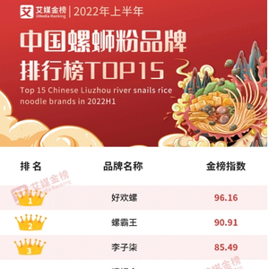 前不久,艾瑞金榜最新发布的《2022年上半年中国螺蛳粉品牌排行榜Top15》中,好欢螺、螺霸王、李子柒、嘻螺会、柳江人家、螺状元等知名品牌纷纷上榜。其中,好欢螺以96.16的金榜指数摘得桂冠,与第二名螺霸王90.91拉开了近5个指数的距离,而大家最为熟悉的李子柒则以85.49的指数位列第三。