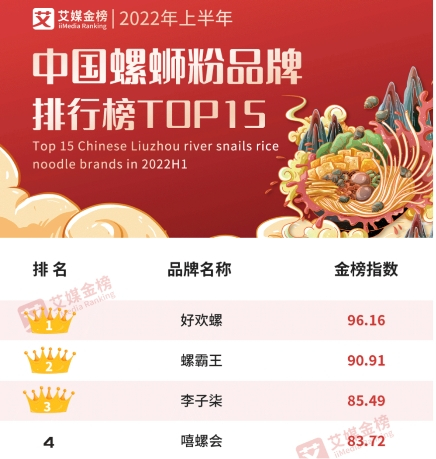 好欢螺斩获《2022年上半年中国螺蛳粉品牌排行榜Top15》第一名