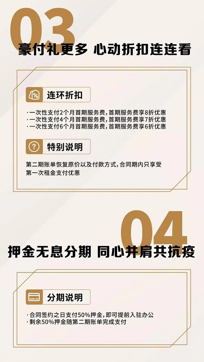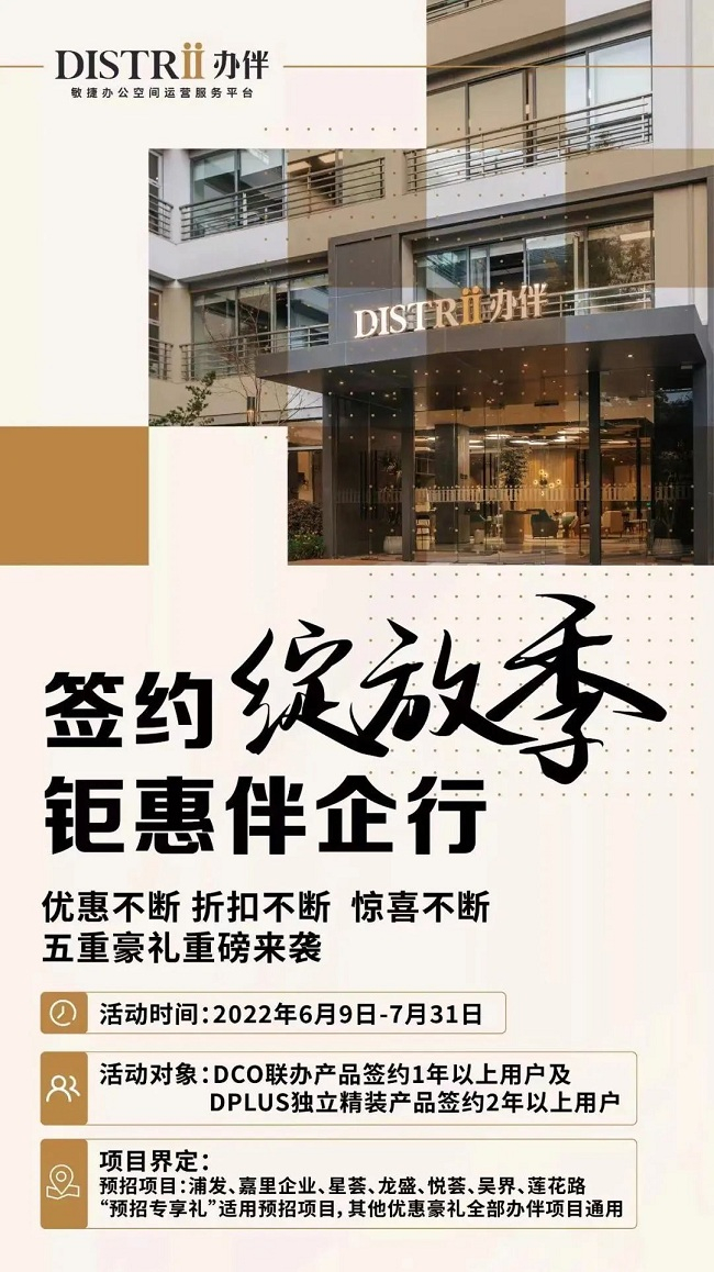 同时,Distrii办伴直营店在堂堂办公平台也推出了“签约绽放季、钜惠伴企行”专项活动,针对DCO联办产品签约1年以上用户及DPLUS独立精装产品签约2年以上用户给予减租免租、连环折扣、押金无息分期等优惠政策,同时还联合上海银行推出专项金融支持服务。